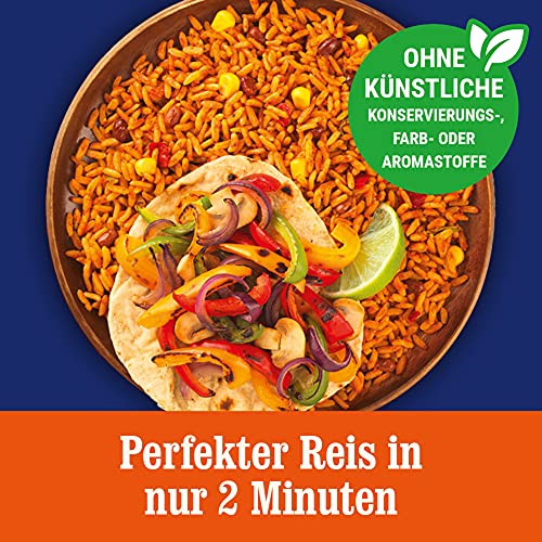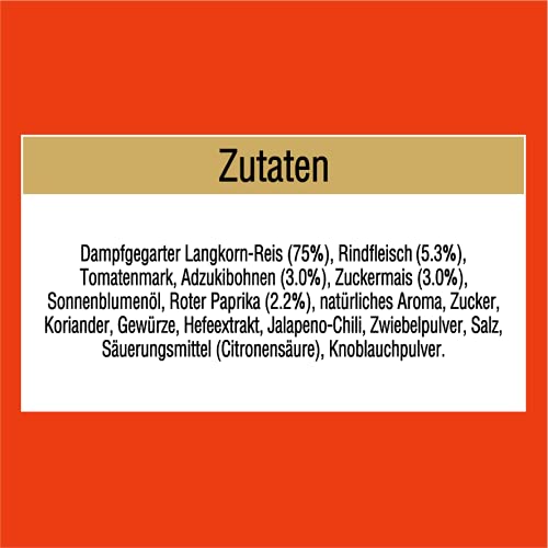 Zutaten: Dampfgegarter Langkorn-Reis (75%), Rindfleisch (5.3%), Tomatenmark, Adzukibohnen (3.0%), Zuckermais (3.0%), Sonnenblumenöl, Roter Paprika (2.2%), natürliches Aroma, Zucker, Koriander, Gewürze, Hefeextrakt, Jalapeno-Chili, Zwiebelpulver, Salz, Säuerungsmittel (Citronensäure), Knoblauchpulver.