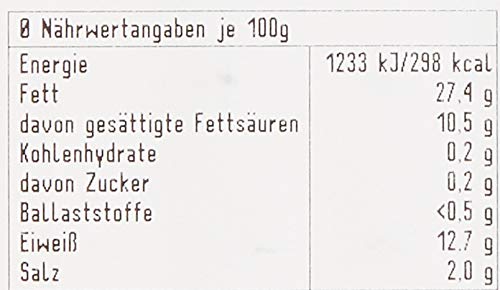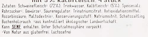 Schweinefleisch* (72%), Trinkwasser, Kalbfleisch* (5%), Speisesalz, Rohrzucker*, Gewürze*, Säureregulator: Trinatriumcitrat; Antioxidationsmittel: Ascorbinsäure; Maltodextrin*, Konservierungsstoff: Natriumnitrit; Schafssaitling, Buchenholzrauch. *aus kontrolliert ökologischer Landwirtschaft. Kann Spuren von SENF enhalten.