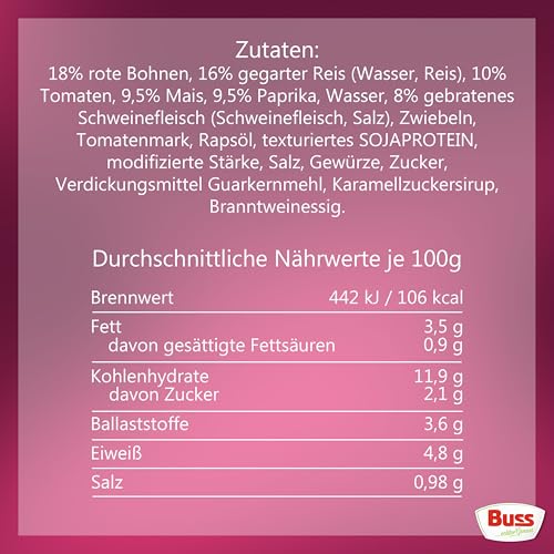 Zutaten: 18% rote Bohnen, 16% gegarter Reis (Wasser, Reis), 10% Tomaten, 9,5% Mais, 9,5% Paprika, Wasser, 8% gebratenes Schweinefleisch (Schweinefleisch, Salz), Zwiebeln, Tomatenmark, Rapsöl, texturiertes SOJAPROTEIN, modifizierte Stärke, Salz, Gewürze, Zucker, Verdickungsmittel Guarkernmehl, Karamellzuckersirup, Branntweinessig.