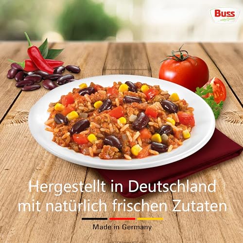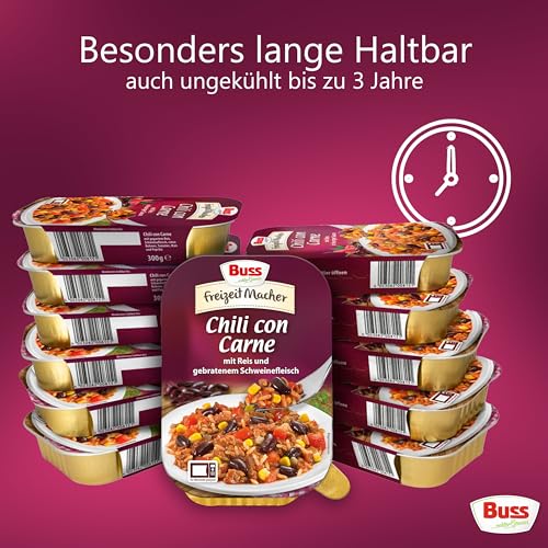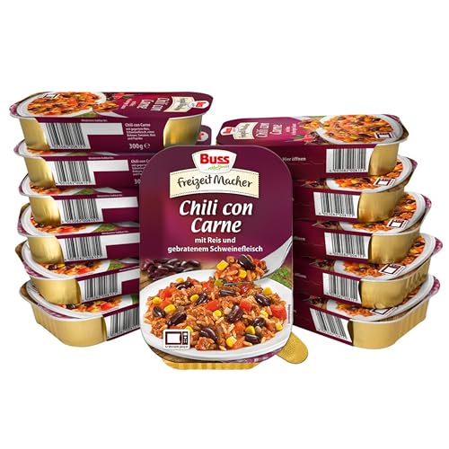 Buss Fertiggerichte – Freizeitmacher – Pikantes Chili con Carne mit Hackfleisch, Reis, roten Bohnen, Mais, Tomaten und Paprika – Fertiggericht für die Mikrowelle in Schalen – Lange haltbar – 12 x 300 g