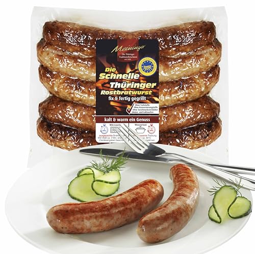 Unsere Original Thüringer Rostbratwurst ist bekannt für ihre würzige Geschmacksnote, die Grillabende und Pfannengerichte, die sie zu einem besonderen kulinarischen Erlebnis macht. Ganz gleich, ob Sie diese auf dem Grill brutzeln, in der Pfanne anbraten oder wie bei diesem speziellen Produkt, fix und fertig geliefert, im Wasserbad einfach nur aufwärmen – die unverkennbare Würze bleibt dabei erhalten. Unsere fertig gegrillte Thüringer Rostbratwurst können Sie mit der Vacuumverpackung in einem Wasserbad von ca. 80°C in 15 Min. erwärmen, oder aus der Vacuumverpackung entnehmen und in der Mikrowelle bei 650 Watt ca. 2 Min. erhitzen. Als Spezialität der Region wird unsere Thüringer Rostbratwurst mit traditionellen Gewürzen und frischem Fleisch hergestellt. Genießen Sie unsere Thüringer Rostbratwurst „fix&fertig“ wenn es schnell gehen muss und Sie dennoch ein kulinarisches Highlight erleben möchten.
