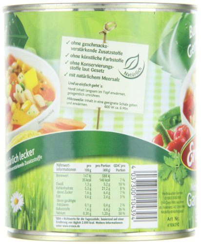 Sie hätten gern einen Gemüsegarten? Hier haben Sie einen zum Mitnehmen, denn beim bunten Gemüsetopf von Erasco stecken Kohlrabi, Möhren, Mais, Erbsen und Paprika zusammen mit ausgesuchten Kräutern und leckeren Nudeln in der Dose. Ein herrlich vegetarischer Genuss, der beim Essen nichts vermissen lässt! Mit Erasco für einen nachhaltigen Alltag Umweltschutz geht uns alle an, denn es gibt keinen Planeten B. Darum setzt sich Erasco schon lange für einen nachhaltigen Umgang mit Ressourcen ein – zum Beispiel mit Dosen aus wiederverwertbarem Weißblech. Die Konserve in Ihrer Vorratskammer könnte morgen zu einem Fahrrad werden. Wenn Sie mit dem Genießen fertig sind, müssen sie die leere Dose dazu nur im Recyclingmüll entsorgen. Denn Metall ist nicht nur langlebig, sondern auch hervorragend recycelbar. Das Gute daran ist das Gute darin Erasco hat die Leidenschaft, schnelle, nahrhafte und vor allem leckere Mahlzeiten für alle anzubieten – und zwar ohne Abstriche bei Qualität und Genuss. Beim Kochen unserer exklusiven Erasco Rezepturen gehen wir deshalb auch besonders schonend und sorgsam vor. Denn je kürzer die Garzeit, desto besser bleiben der Geschmack und die Nährstoffe erhalten. *Um unsere Suppen und Eintöpfe in Dosen haltbar zu machen, verwenden wir dasselbe Verfahren, das früher bereits unsere Großmütter beim Einkochen oder Einmachen kannten und benutzten. Die harmonisch aufeinander abgestimmten Zutaten werden mit ausreichend Flüssigkeit wie z.B. Brühe übergossen. Dann verschließen wir alles luftdicht und garen das Gericht gleichmäßig so kurz wie möglich, aber so lange wie nötig. So werden die wertvollen Zutaten gut geschützt, so dass sie lange haltbar bleiben.