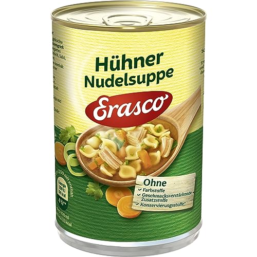 Erasco klare Hühner-Nudel Suppe wird aus leckeren Muschelnudeln, Möhren sowie aus ausgesuchtem Gemüse und zartem Hühnerfleisch kombiniert mit aromatischen Kräutern zubereitet.