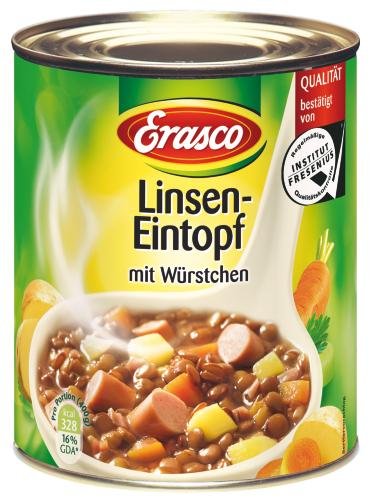 Wasser, Linsen, 10% Bockwurstscheiben (Schweinefleisch, Wasser Jodsalz, Speck, Milcheiweiß, Gewürzle (enthält Sellerie), Würze, Dextrose, Milchzucker, Rauch), Kartoffeln, 7% Möhren, 1% durchwachsener Rauchspeck (mit Salz), Würze, (enthält Soja), Tomatenmark, Jodsalz, Aroma (enthält Weizen, Soja, und Sellerie), modifizierte Stärke, Geschmacksverstärker Mononatriumglutamat, Verdickungsmittel Guarkernmehl, Peterslilie, Salz, Milchzucker, Zucker.