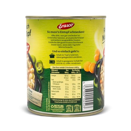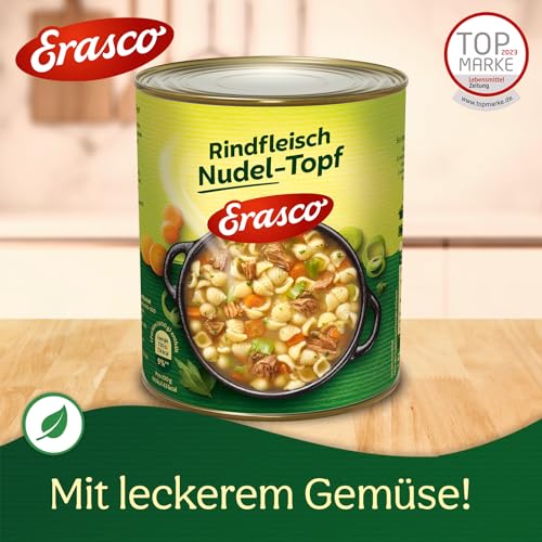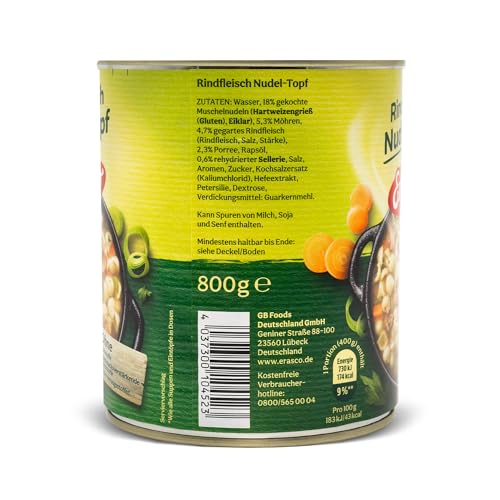Schnelle und herzhafte Mahlzeiten liegen uns bei Erasco am Herzen und wir haben genau das Richtige für dich – unseren Rindfleisch Nudel-Topf. Der Nudel-Topf enthält zarte Rindfleischstückchen und aromatische Gartenkräuter, die dir das Wasser im Mund zusammenlaufen lassen. Aufgrund der bewährten Erasco-Technologie kannst du dieses leckere Gericht in nur wenigen Minuten zubereiten – perfekt für ein schnelles Abendessen zuhause oder unterwegs. Mit Erasco für einen nachhaltigen Alltag Umweltschutz und Nachhaltigkeit sind uns wichtig bei Erasco, und deshalb verwenden wir nur Dosen aus wiederverwertbarem Weißblech. Wenn du fertig gegessen hast, kannst du die leere Dose einfach im Recyclingmüll entsorgen. Metall ist nicht nur langlebig, sondern auch hervorragend recycelbar – das ist unsere Art, etwas Gutes zu tun. Gutes Essen ohne Kompromisse Bei Erasco glauben wir, dass gutes Essen schnell und einfach sein kann, ohne Kompromisse bei Qualität und Geschmack einzugehen. Wir verwenden keine geschmacksverstärkenden Zusatzstoffe, keine geschmacksverstärkende Zusatzstoffe und Farbstoffe. Das Ergebnis ist ein köstlicher Rindfleisch Nudel-Topf, der einfach zu zubereiten ist und auch für Camping und Festivals geeignet ist. Unser Rindfleisch Nudel-Topf wird schonend und mit viel Geduld/Liebe zubereitet, bei dem die Zutaten mit ausreichend Brühe übergossen und gleichmäßig gegart werden. Dies gewährleistet eine lange Haltbarkeit. Gönn dir eine leckere und herzhafte Mahlzeit mit Erasco, und lass dich von unserem Rindfleisch Nudel-Topf verwöhnen. *Es werden Konservierungsstoffe laut deutschem Gesetz verwendet