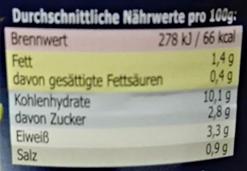 Zutaten: Fleischbrühe, Schälerbsen 19%, Kartoffeln 15,5%, Gemüse 4% (Möhren, Porree), Schweinekopffleisch 3,8%, Halberstädter Würstchen 2,8% (Schweine- und Rindfleisch, Trinkwasser, Speisesalz, Glukosesirup, Gewürze, Würze, Stabilisator: Diphosphate, Antioxidationsittel: Ascorbinsäure, Konservierungsstoff: Natriumnitrat, Naturdarm, Rauch), Weizen mehl, Speck, Würze, Speisesalz, gekörnte Brühe (Würze, Speisesalz, pflanzliches Fett) Kräuter und Gewürze (mit Sellerie).