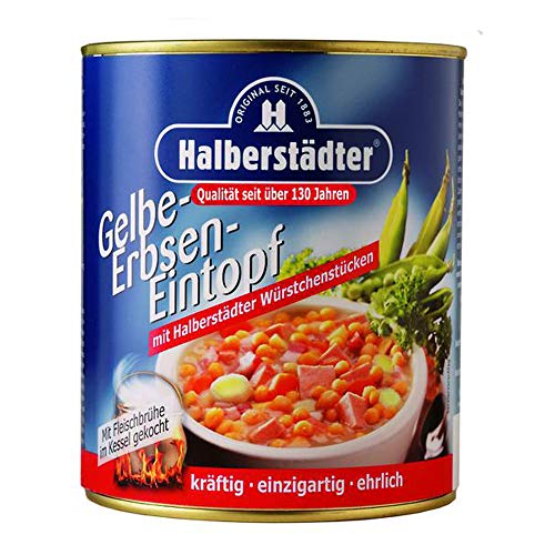 Allergene: Weizenmehl, Sellerie. Herstellerinformationen: Halberstädter Würstchen- und Konservenvertriebs GmbH, Große Ringstraße, 38820 Halberstadt Halberstädter Gelbe Erbsen-Eintopf 800g Dose Halberstädter Gelbe Erbsen-Eintopf 800g Dose.
