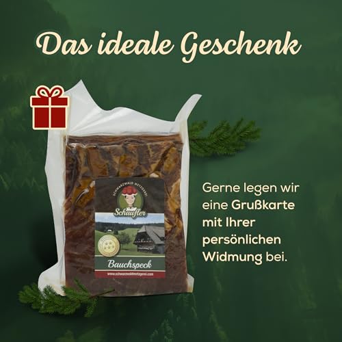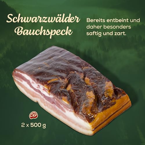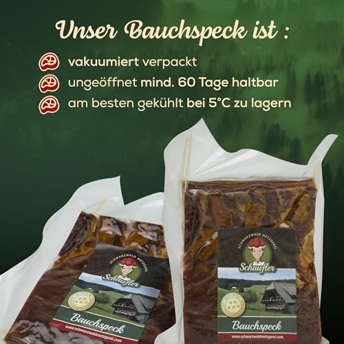 PRODUKTDETAILS: Für die beste Qualität salzen wir unseren Schwarzwälder Bauchspeck von Hand und lassen ihn über mehrere Wochen reifen. Ein Stück wiegt 1000g und ist dank Vakuumierung min. 60 Tage haltbar. Wir wünschen einen guten Appetit