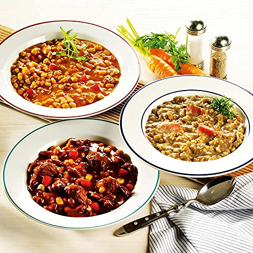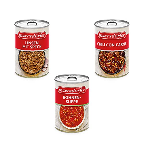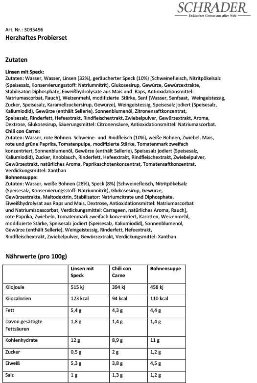Bestehend aus: CHILI CON CARNE – Eintopf aus Rind- undSchweinefleisch, roten und weißen Bohnen, Mais und mit Chili würzigabgestimmt; LINSEN MIT SPECK – Linsen mit herzhaftem Räucher- undSelchspeck, Zwiebeln, Senf und Gewürzen sowie BOHNEN-SUPPE –schonend zubereitet nach traditioneller Rezeptur aus weißen Bohnenund aromatischem Kaiserfleisch, leicht pikante Würzung mit Paprika.Tafelfertig. 3 Dosen à 400g.Chili con Carne: Zutaten: Wasser, rote Bohnen. Schweine- undRindfleisch (10%), weiße Bohnen, Zwiebel, Mais, rote und grünePaprika, Tomatenpulpe, modifizierte Stärke, Tomatenmark zweifachkonzentriert, Sonnenblumenöl, Gewürze (enthält Sellerie),Speisesalz jodiert (Speisesalz, Kaliumiodid), Zucker, Knoblauch,Rinderfett, Hefeextrakt, Rindfleischextrakt, Zwiebelpulver,Gewürzextrakt, natürliches Aroma, Paprikaschotenkonzentrat,Tomatensaftkonzentrat, Verdickungsmittel: Xanthan Nährwerte pro 100g:Energie 394 kJ (94 kCal); Fett 4,3 g; davon gesättigte Fettsäuren1,4 g; Kohlenhydrate 8,9 g; davon Zucker 2 g; Eiweiss 3,8 g; Salz 1,3g Linsen mit Speck: Zutaten: Zutaten: Wasser, Wasser, Linsen (32%),geräucherter Speck (10%) [Schweinefleisch, Nitritpökelsalz(Speisesalz, Konservierungsstoff: Natriumnitrit), Glukosesirup,Gewürze, Gewürzextrakte, Stabilisator:Diphosphate,Eiweißhydrolysate aus Mais und Raps, Antioxidationsmittel:Natriumascorbat, Rauch], Weizenmehl, modifizierte Stärke, Senf(Wasser, Senfsaat, Weingeistessig, Zucker, Speisesalz,Karamellzuckersirup, Gewürze), Weingeistessig, Speisesalz jodiert(Speisesalz, Kaliumiodid), Gewürze (enthält Sellerie),Sonnenblumenöl, Zitronensaftkonzentrat, Speisesalz, Rinderfett,Hefeextrakt, Rindfleischextrakt, Zwiebelpulver, Gewürzextrakt, Aroma,Dextrose, Glukosesirup, Säuerungsmittel: Citronensäure,Antioxidationsmittel: Natriumascorbat. Nährwerte pro 100g: Energie515 kJ (123 kCal); Fett 5,4 g; davon gesättigte Fettsäuren 1,8 g;Kohlenhydrate 12 g; davon Zucker 0,5 g; Eiweiss 5,3 g; Salz 1 gWürzige Bohnensup…