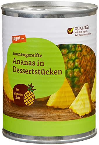 Guter Geschmack von guten Zutaten, deshalb steckt in unseren rund 600 Produkten mit dem tegut… Reinheitsversprechen nur Gutes. Hier verzichten wir grundsätzlich auf Geschmacksverstärker, Farbstoffe, Hefeextrakt, Süßungsmittel und gehärtete Fette. Dafür legen wir großen Wert auf die Qualität der Zutaten. Wir verwenden zum Beispiel ausschließlich Eier, die mindestens aus Bodenhaltung stammen. Darüber hinaus achten wir auf nachhaltige Rohstoffe sowie Materialien und setzen uns zudem für Produkte „Ohne Gentechnik“ ein. Weil gute Lebensmittel die Grundlage für Lebensqualität und Wohlbefinden sind. So reifen unsere saftigen tegut… Ananas bis zu ihrem vollen Aroma heran und werden erntefrisch verarbeitet. Die Früchte werden in Stücke geschnitten und im eigenen Saft ohne zugesetzten Zucker eingelegt. Ideal sind die natursüßen Köstlichkeiten für exotische Gerichte aller Art, als Zugabe in Joghurt oder schmackhaft in Obstsalat. Produktdaten Nährwerte